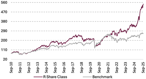 In den vergangenen 15 Jahren erzielte der Fonds +530 Prozent, was einer durchschnittlichen Jahresrendite von mehr als 13 Prozent entspricht. Zum Vergleich: Der Sektordurchschnitt liegt bei rund 220 Prozent (ca. 8 Prozent p. a.). Im laufenden Jahr 2025 legt der Fonds rund 50 Prozent zu, während der MSCI Europe Small Cap Index nur 8 Prozent gewinnt. Mehr als 80 Prozent der Outperformance stammen aus der gezielten Titelauswahl – ein klarer Beleg dafür, dass aktives Management in ineffizienten Marktsegmenten funktioniert. Besonders stark entwickelten sich zuletzt Industriepositionen wie Rheinmetall und Renk, aber auch VusionGroup (digitale Handelslösungen) und Energean Oil & Gas trugen entscheidend bei. Mit einem Active Share von über 90 Prozent zeigt der Fonds zudem seine Unabhängigkeit vom Index.